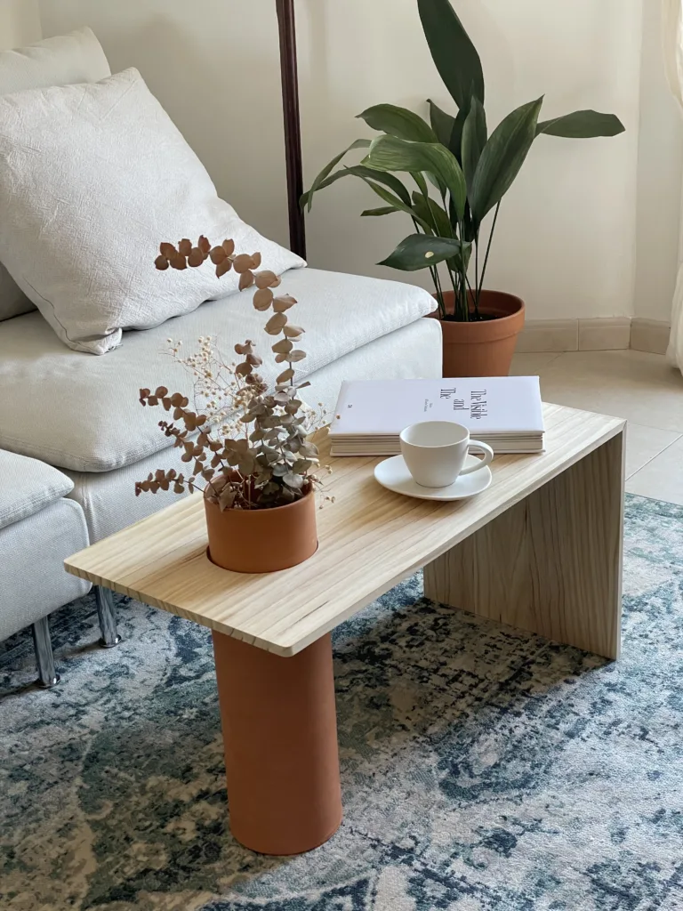 Coffee table featuring a ceramic element with both decorative and structural use.